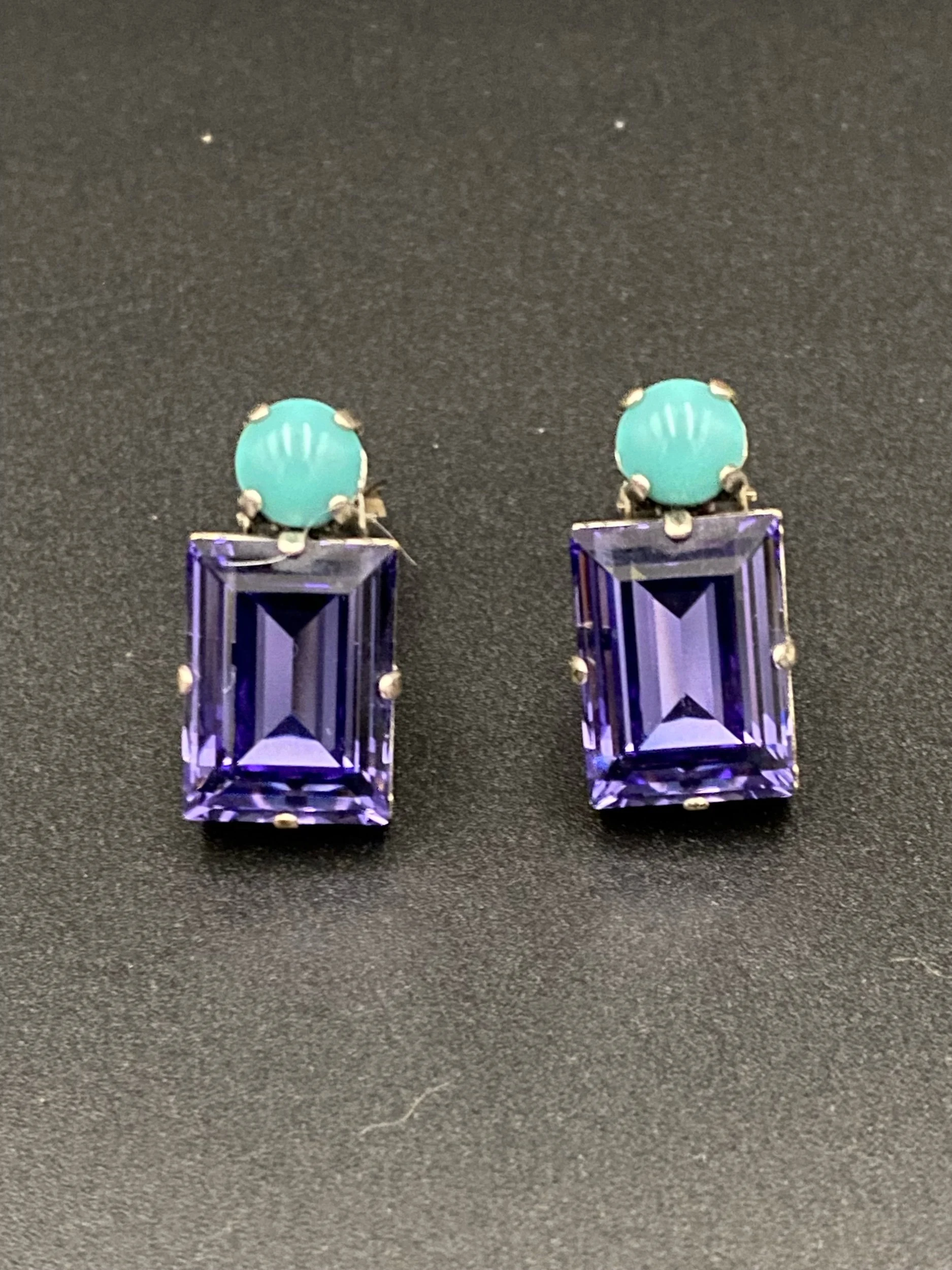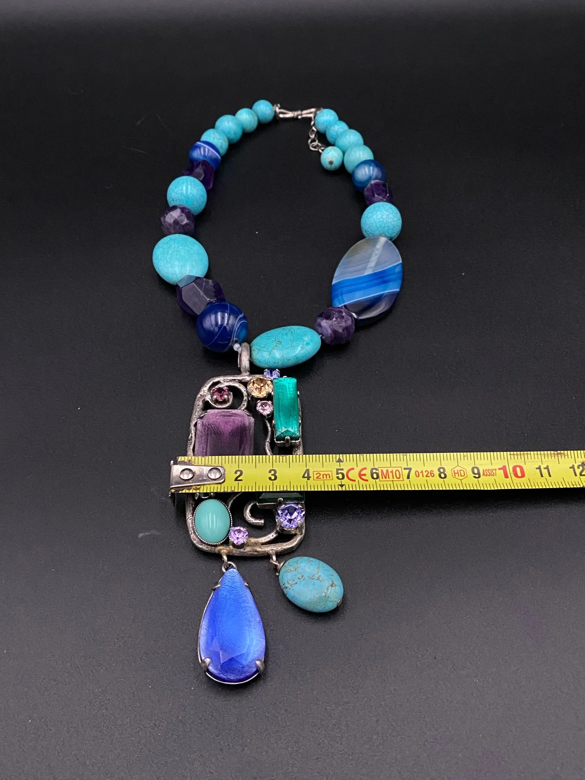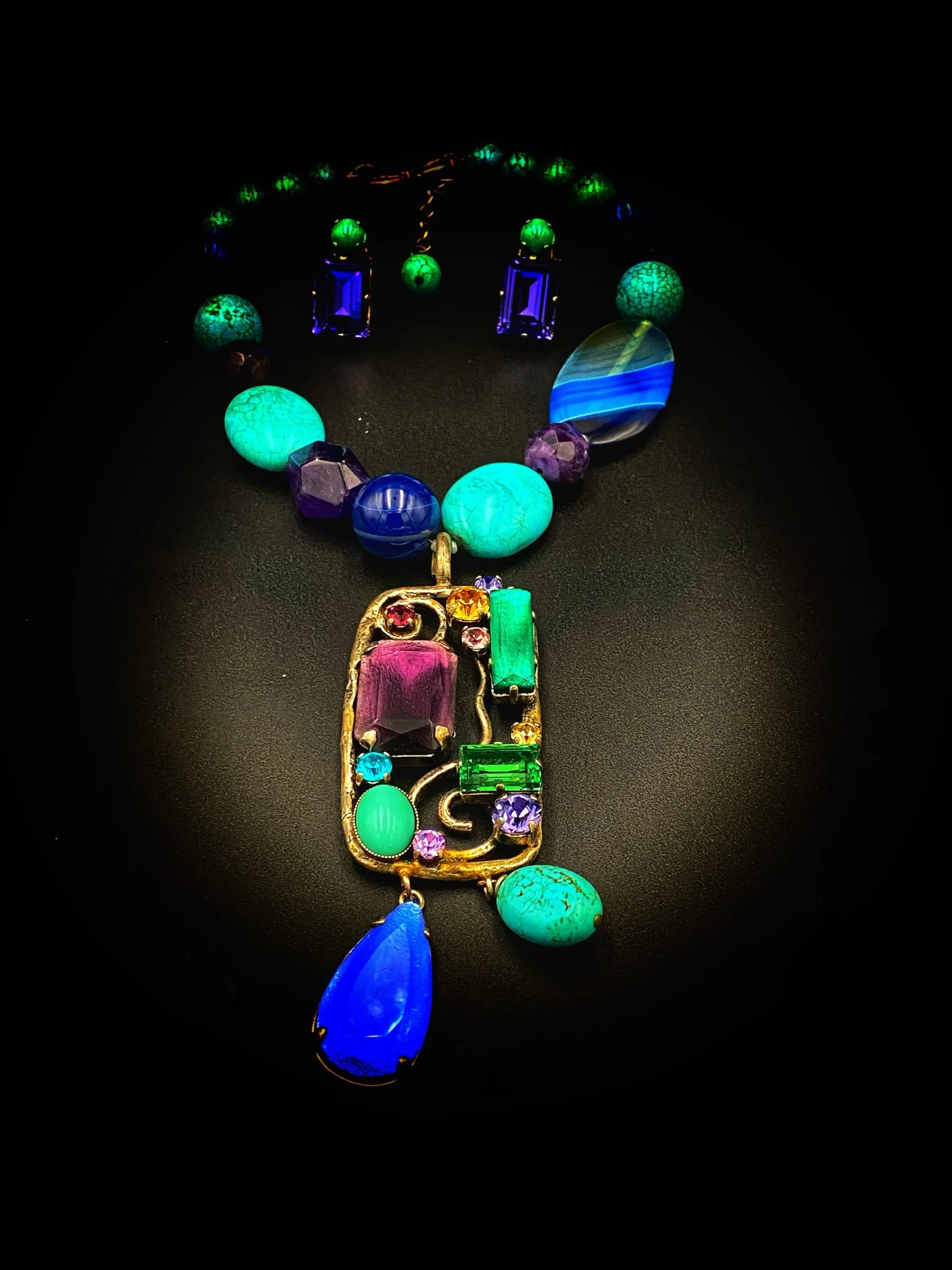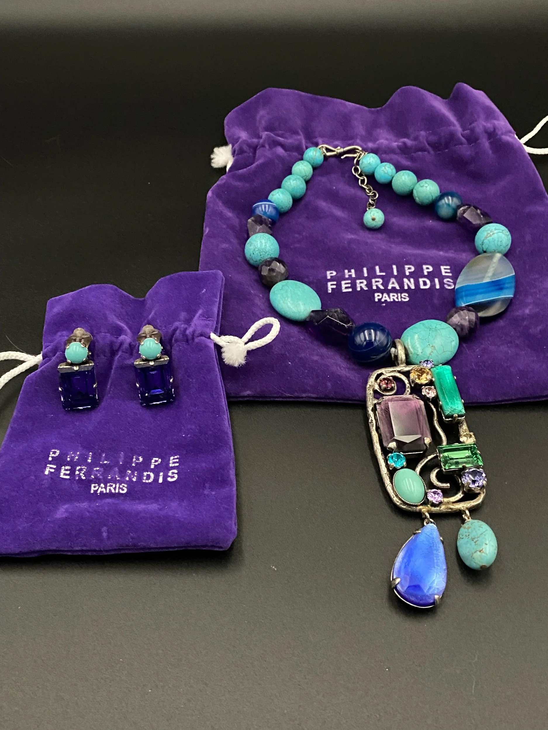 Philippe Ferrandis vintage (collier statement turquoise/multicolore + boucles d’oreilles clips bleues + 2 pochons authentiques